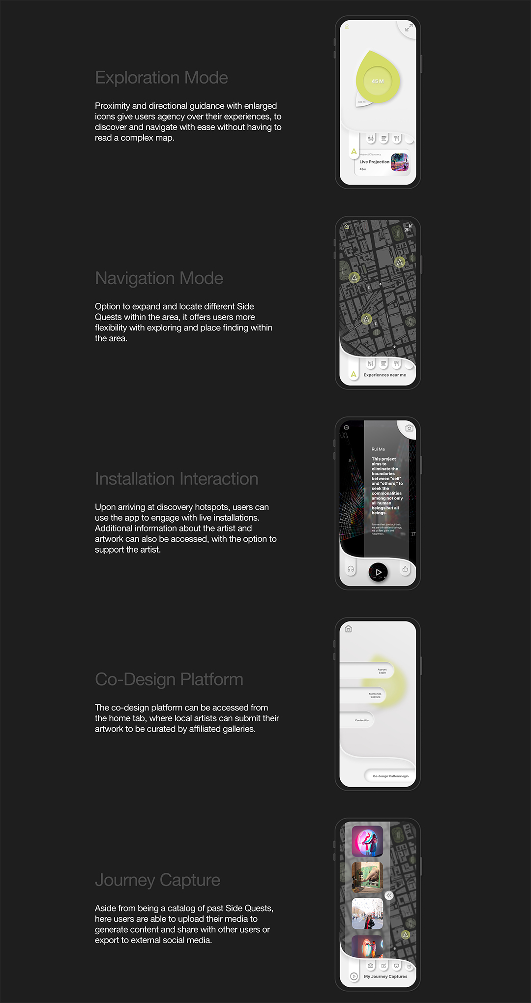 While Side-Quest can be experienced in full by any pedestrian chancing by, the accompanying app elevates and unifies the platform. It allows designed interactions with the installation pieces, donations to artists or affiliated causes, discovery of other side-quests, and proposal submissions from local artists.